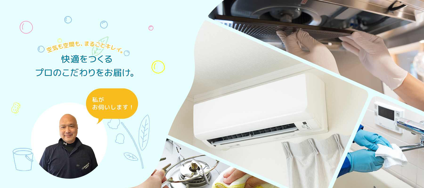 エアコンクリーニング、ハウスクリーニング、空室清掃、墓石クリーニングなど、プロの技術で気持ちの良い環境づくりをお手伝い。その他住まいのお困りごとも、何でもご相談ください!