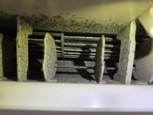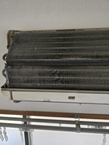 風が出るファンの所と風向きを変えるルーバーの部分に黒いポチポチ(ほこりとカビ)が付着してます。