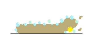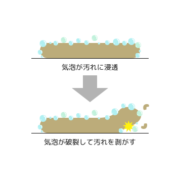 とにかく微細な気泡が、付着した汚れの奥の隙間にまで水と共に侵入。気泡はマイナスに帯電しているため、気泡同士が合体することなく水中に拡散し、隅々まで汚れに密着します。